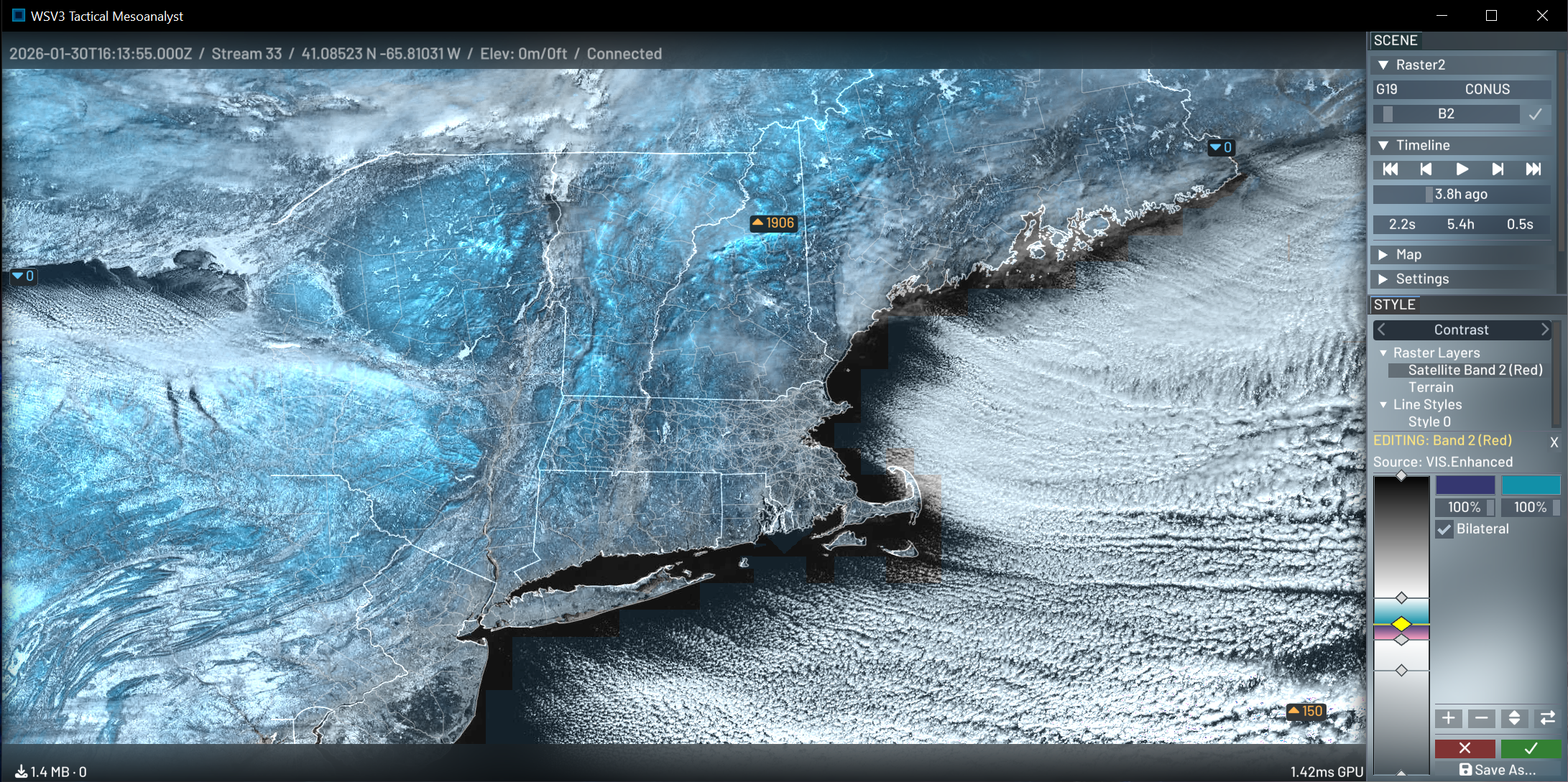 V0 is an innovation sandbox for the development of the remainder of the next-gen product, representing a milestone minimal product of valuable, unique, and narrow functionality. Likely already the most optimized, lowest latency, and highest quality combined viewer and data service for full-resolution GPU-based viewing of realtime GOES-R CMIP timeseries datasets, WSV3 Tactical Mesoanalyst V0 reproduces the 0.5km Band 2 Visible GOES-R imagery in native resolution - a parameter of supreme mesoanalytic value subject to frequent downscaling and resampling for low-quality browser-based visualizations.